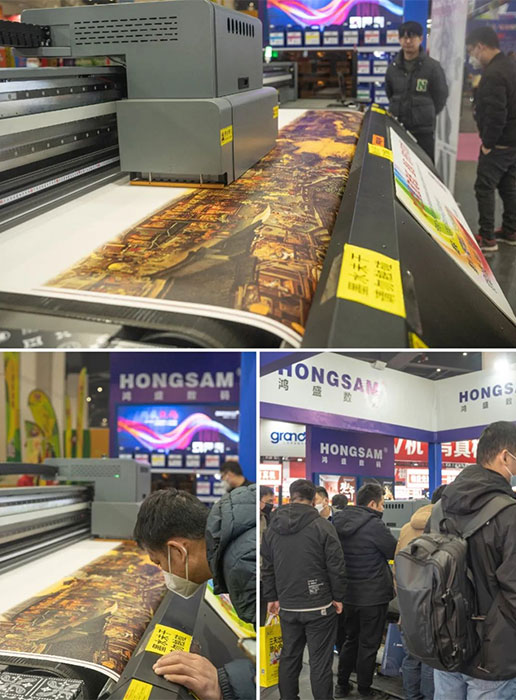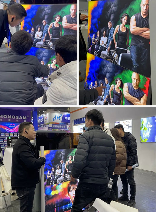 此次展會現場鴻盛數碼展示了市場uv軟膜燈箱與鴻盛水性乳膠打印紡織品廣告布燈箱,讓客戶現場對比2種方案的差異,也引起了不少客戶對乳膠的興趣。