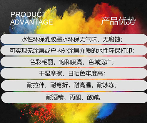 環保水性乳膠墨水綠色環保,無論是打印過程中,還是打印完成的成品,都沒有異味,有效提升產品環保品質,迎合市場需要;改善生產環境,降低用工風險;沒有易燃耗材,降低生產消防風險。適應打印介質的多樣性和成像持久性的的優點,尤其適合裝修裝飾、壁紙壁畫等環保要求極高的行業當中,是一款代表未來打印噴墨方向的功能性墨水。