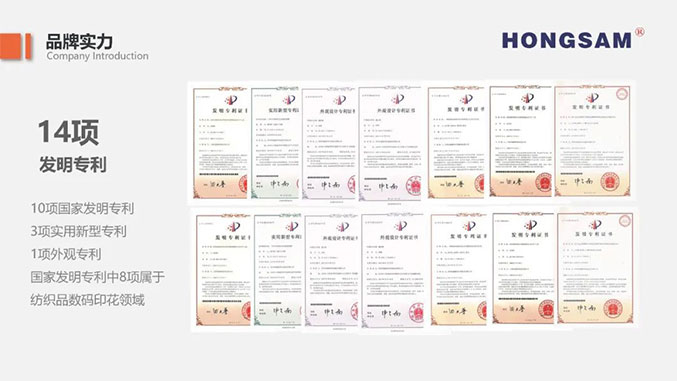 鴻盛數(shù)碼通過持續(xù)技術(shù)研發(fā)及工藝創(chuàng)新,降低了客戶對進(jìn)口墨水的依賴度及采購成本,促進(jìn)行業(yè)向節(jié)能環(huán)保、清潔生產(chǎn)方向轉(zhuǎn)型。企業(yè)針對不同系列產(chǎn)品,建立專項(xiàng)研發(fā)項(xiàng)目組,保證每款產(chǎn)品的持續(xù)跟進(jìn)優(yōu)化。截止目前,鴻盛數(shù)碼擁有14項(xiàng)專利,其中10項(xiàng)國家發(fā)明專利,其中8項(xiàng)為數(shù)碼印花類的專利,囊括鴻盛數(shù)碼紡織五朵金花“絲美特®”酸性染料墨水、“鴻美®”高溫分散墨水,“捷特絲®”紡織涂料墨水、“銳美®”活性染料墨水、鴻盛陽離子染料墨水。