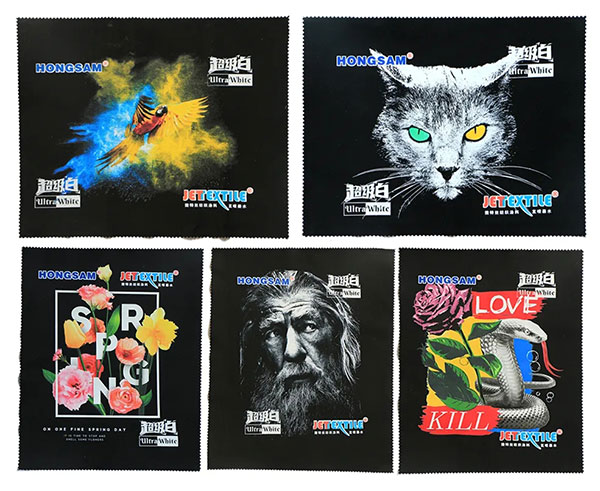 8、膜轉印工藝流程:區分正反面→打印(先彩后白)→預烘(100-120℃)→撒熱熔膠粉→烘干(熱熔膠粉烘至熔融狀態,150-160℃,2-3min)→燙印(150-160℃,15-20S)→基材剝離(冷撕/熱撕)→成品。