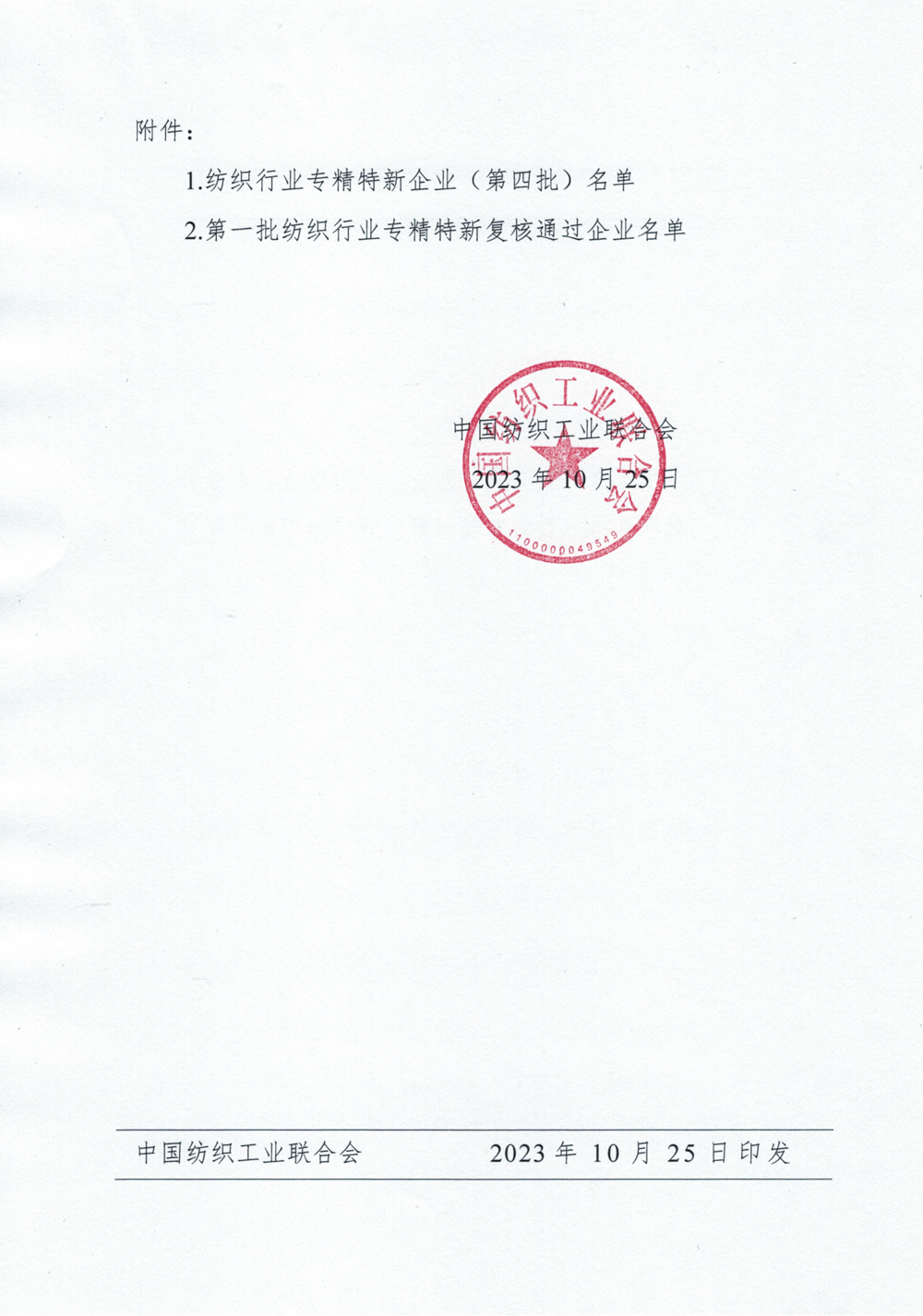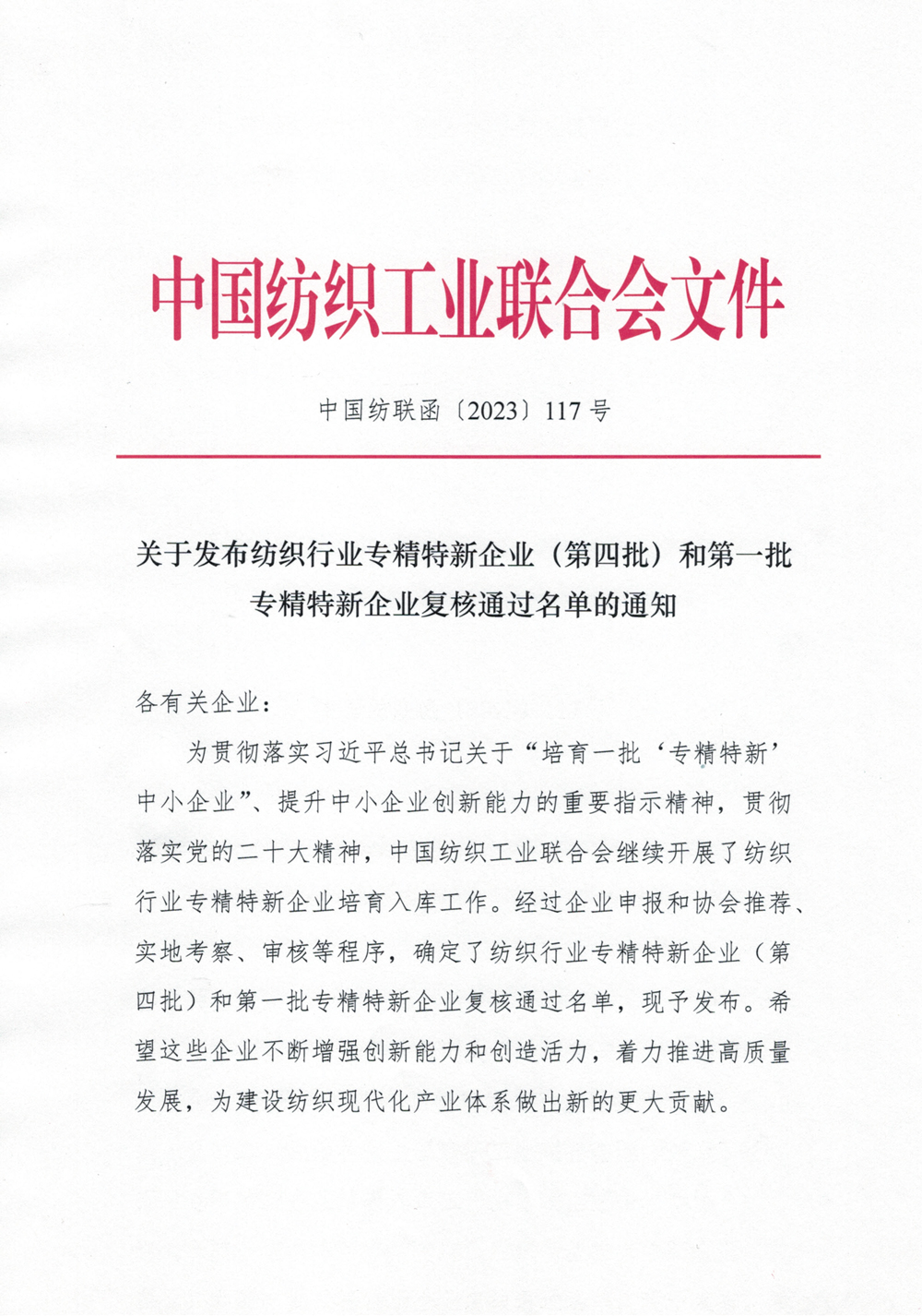 2023年10月25日,中國紡織工業聯合會文件《關于發布紡織行業專精特新企業(第四批)和第一批專精特新企業復核通過名單的通知》(中國紡聯函〔2023〕117號),公布了中國紡織工業聯合會2023年第四批“專精特新”企業認定和第一批專精特新企業復核通過名單,鴻盛數碼榮獲中國紡織工業聯合會“專精特新”企業(第四批認定)。