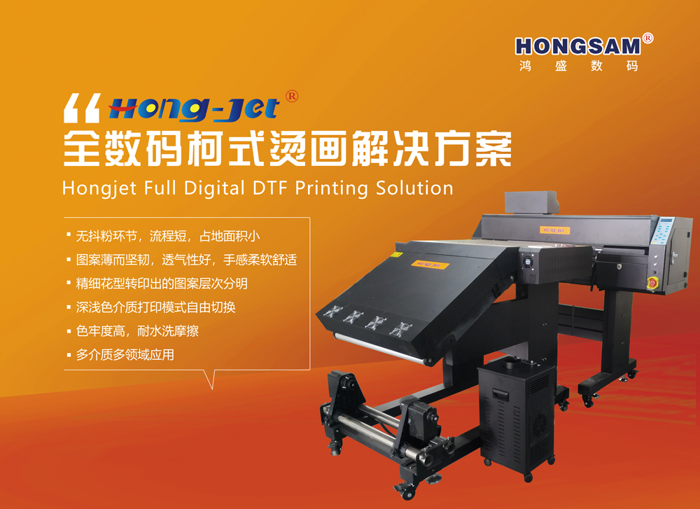 鴻捷全數碼柯式燙畫解決方案生產操作簡單,適用材料廣,手感軟,牢度好,適合轉印溫度可選擇區間大,產品質量容易控制,成品率高,噪音小,占地小。是基于市面上現有的數碼印花轉印技術的又一次新的變革,是一種轉印效果更好,用途更廣泛,更環保性的解決方案。目前已在服裝服飾,箱包鞋材,家紡家裝、建筑材料等行業進行應用。