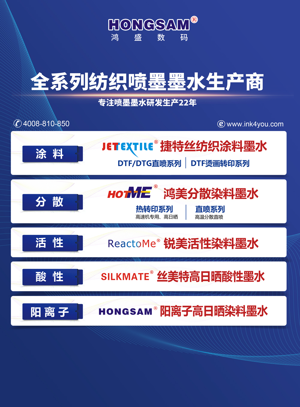 中國國際紡織機械展覽會暨ITMA亞洲展覽會將于2023年11月19-23日在國家會展中心(上海)舉辦。鴻盛數碼是專業研發生產噴墨墨水22年的高新技術企業,作為多項噴墨標準的起草單位,榮獲中國紡織工業聯合會科技進步二等獎、專精特新企業、是全系列紡織噴墨墨水開創者,是捷特絲紡織涂料墨水(匹布直噴墨水、DTG裁片直噴墨水、DTF燙畫墨水)、鴻美分散染料墨水(高溫分散墨水、高耐日曬熱轉印墨水、各種分散直噴墨水)、銳美活性染料墨水(可以提供高濃與標準款)、絲美特高日曬酸性染料墨水一系列墨水發明專利持有者,并都有被中國印染行業協會錄入《中國印染行業協會節能減排先進技術推薦目錄》,其中涂料墨水與高溫分散墨水在匹布直噴市場上占有率遙遙領先,贏得國內外客戶的良好口碑,HONGSAM陽離子染料墨水也是行業應用產品中佼佼者,鴻盛紡織系列墨水遠銷國內外120+國家和地區,為廣大合作企業提供優質產品與服務。本次將攜旗下多款產品及方案參展,鴻盛數碼期待與您相遇!