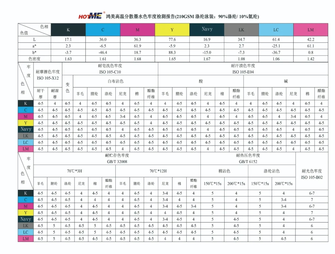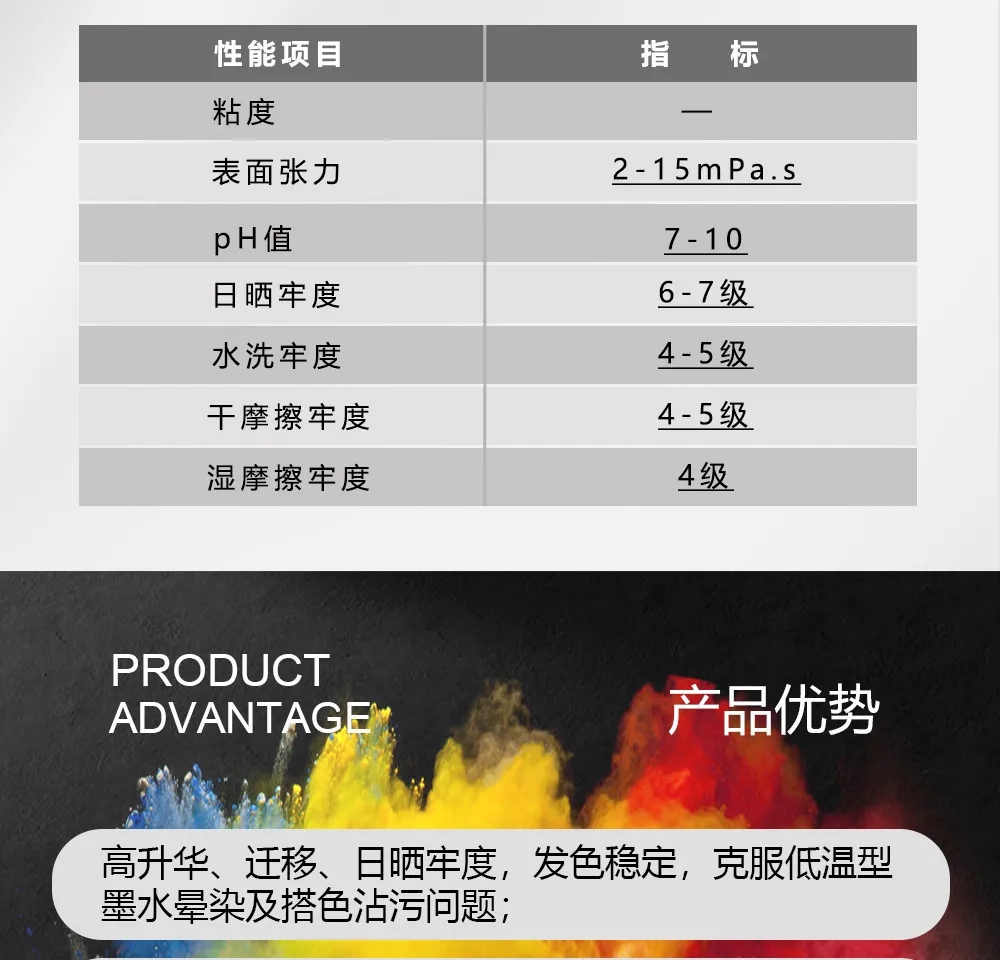1.高升華、遷移、日曬牢度,發色穩定,克服低溫型墨水暈染及搭色沾污問題;
