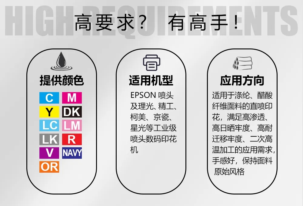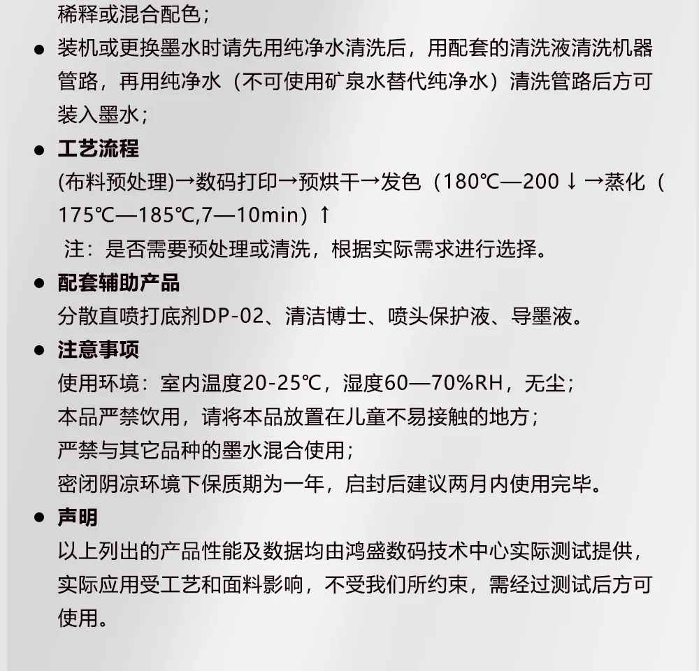 面對滌綸面料的大量應用,尤其是中高端服裝和家紡面料對于產品品質的升級要求,高溫分散直噴墨水應運而生。近期有很多墨水廠家在推高溫分散墨水,但是講到的優勢都是高溫分散墨水廣義的優勢,而對其產品自身的優勢倒很少提及。小編給大家嘮嘮【鴻美高溫分散直噴染料墨水】