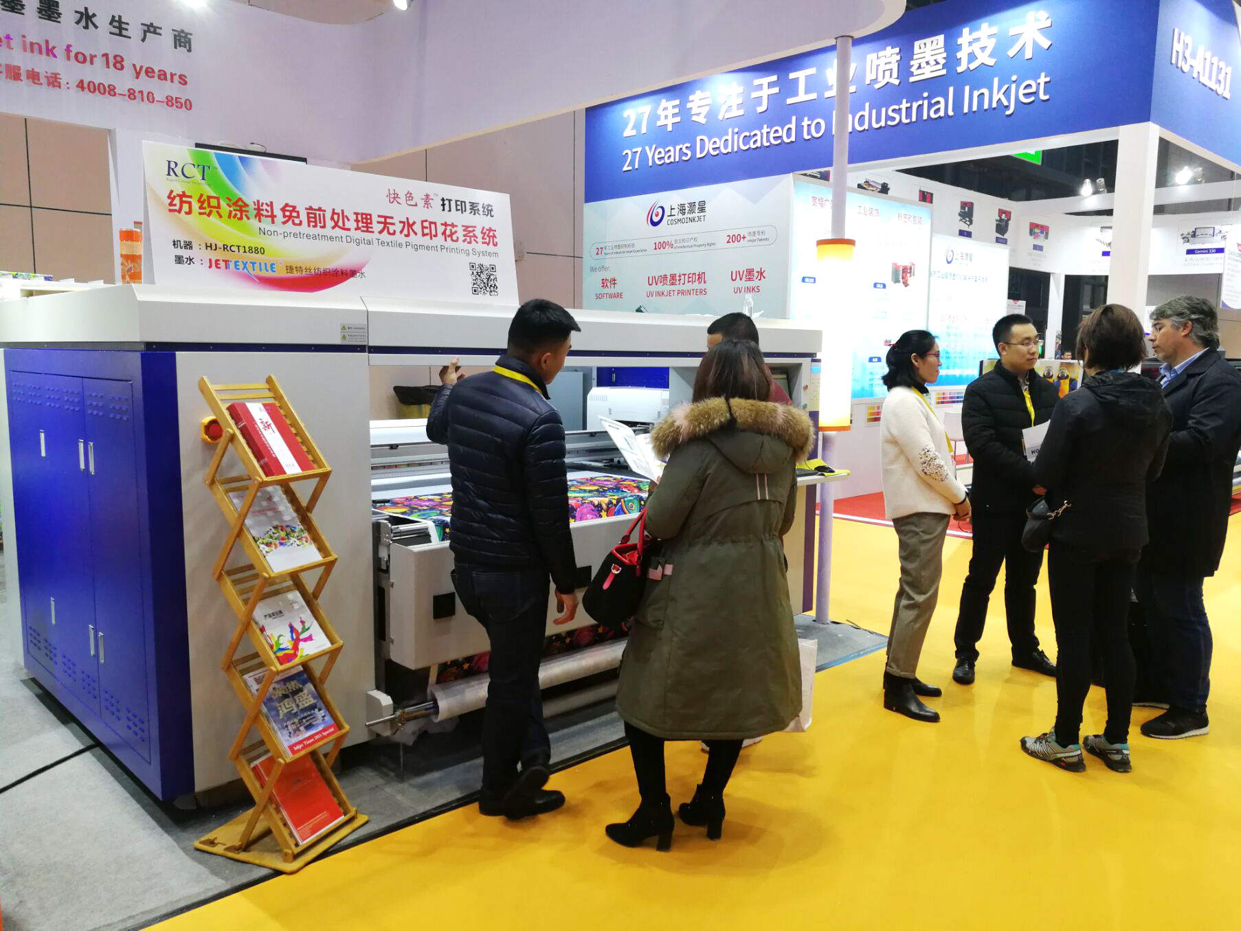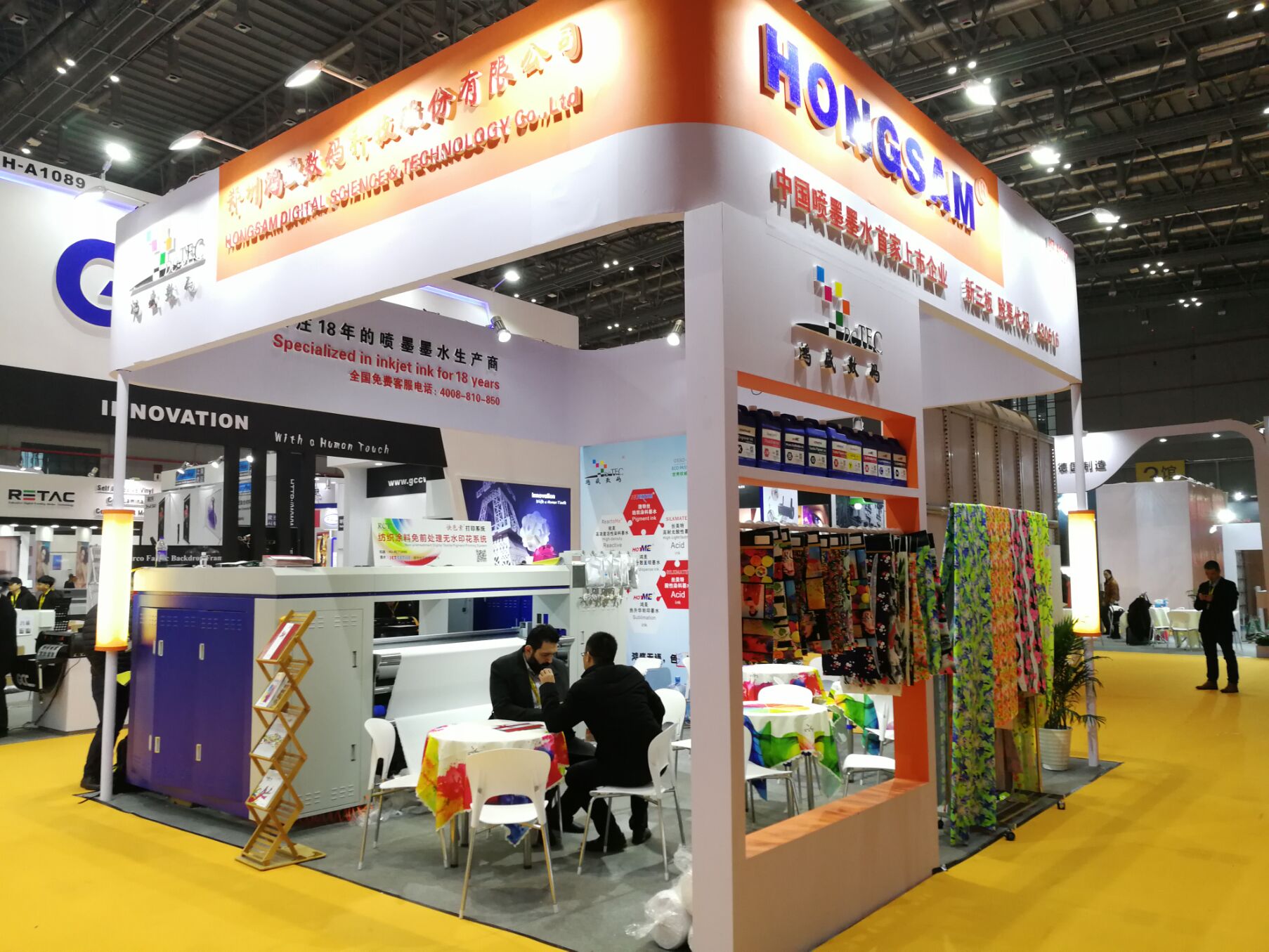現場使用RCT技術打印圖案色彩鮮艷亮麗,吸引了眾多客戶前來咨詢,鴻盛展臺工作人員正在給大家講解快色素技術的特點和優勢。