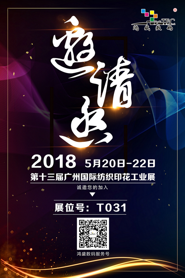 2018年5月20日-22日,廣州琶洲保利世貿博覽館將迎來第十三屆廣州國際紡織印花工業展,作為國內具有影響力的紡織品印花專業展會,必將吸引世界各地眾多紡織印花行業人士的關注。鴻盛數碼此次展示產品包含紡織涂料墨水、分散系列染料墨水、活性染料墨水、酸性染料墨水等在內的多元化產品,滿足不同要求客戶的需求。更有工業噴頭墨水現場打印展示,讓你近距離感受噴墨的魅力。