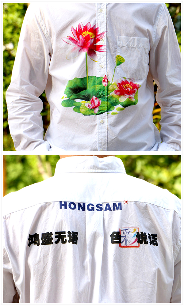 鴻盛參會人員身著“捷特絲”納米涂料墨水印花的成衣作品,倡導無水數碼印花工藝,展示時尚魅麗。服裝以“出水芙蓉”為主題,印花不僅體現出了荷花粉中帶白,荷葉蒼翠欲滴的視覺感官,圖案整體橫跨衣服門襟,實現真正意義上的成衣數碼印花。展會現場,鴻盛數碼的“特色”團隊服裝著實吸引了不少參展商。
