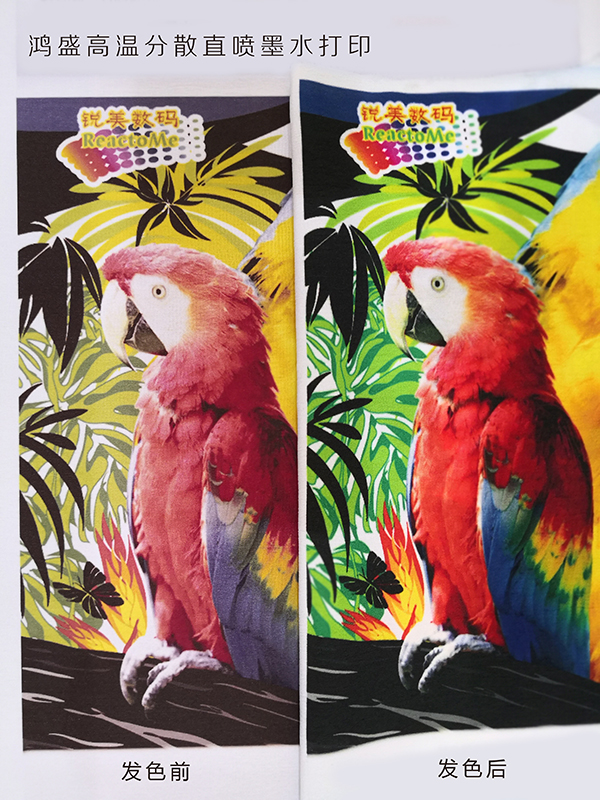 展會現場,鴻盛數碼“鴻美”高日曬熱轉印墨水配套EPSON4個5113噴頭數碼機,現場演示打印效果,色彩精湛,流暢性好。高日曬熱轉印墨水在日曬牢度和耐遷移度方面進行了細致研究,高日曬牢度,相對較好的遷移牢度,色彩艷麗、飽和度高,受到目前進出口紡織品和熱轉印客戶的青睞。