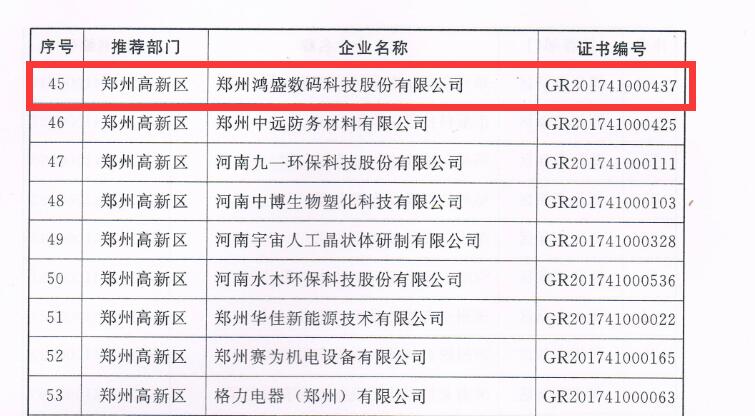 2017年 12月10日,鴻盛數(shù)碼從鄭州高新區(qū)領回了國家高新技術企業(yè)證書,這是鴻盛數(shù)碼第五次通過國家高新技術企業(yè)復審,至此,鴻盛數(shù)碼已連續(xù)13年保持國家高新技術企業(yè)資格。
