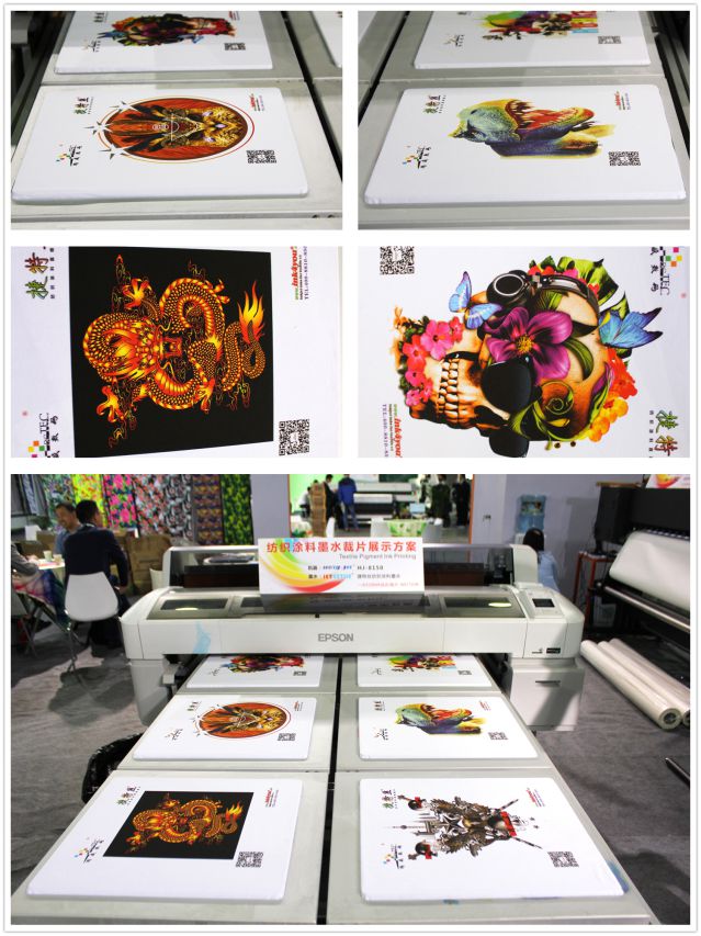 鴻盛數碼“捷特絲”紡織涂料墨水早在2006年就獲得國家發明專利,并于2016年入選第十批中國印染協會節能減排先進目錄。此次展會現場“捷特絲”紡織涂料墨水配套四個五代頭HJ-D1800導帶式高速數碼印花機、多功位HJ-8150平板數碼印花機分別演示了墨水在匹布與T恤裁片等面料上的不同應用。墨水的色彩還原度受到在場觀眾的一致好評。