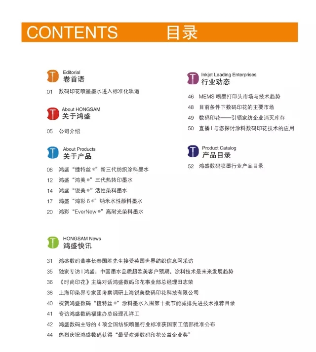 本期新刊內容精彩呈現!這一期雜志以“數碼印花 絢麗綻放”為主題,全面的分析了當下數碼印花的新局勢,并結合各個紡織布料的獨有特性,推薦鴻盛數碼各個專用紡織噴墨墨水。
