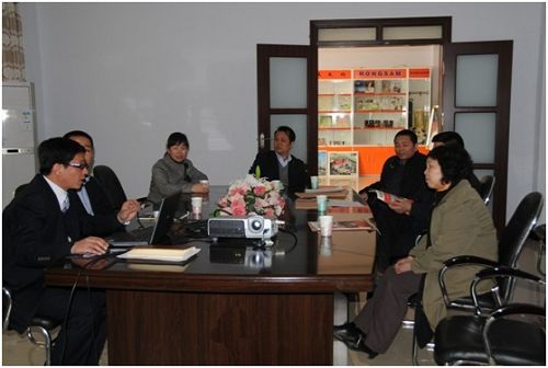河南省發(fā)改委高技術(shù)產(chǎn)業(yè)處黨迎建副處長(右一)聽取鴻盛數(shù)碼董事長秦國勝(左一)做的鴻盛發(fā)展概況的講解,并一起研討鴻盛數(shù)碼今后的工作重點。