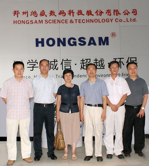 從左至右分別為:鴻盛數碼總經理梁朝民,鄭州高新區管委會副主任宋旭光,河南省發改委高技術產業處黨迎建副處長,河南省發改委高技術產業處陳雁處長,鴻盛數碼董事長秦國勝,鄭州高新區經發局張崔威副局長。