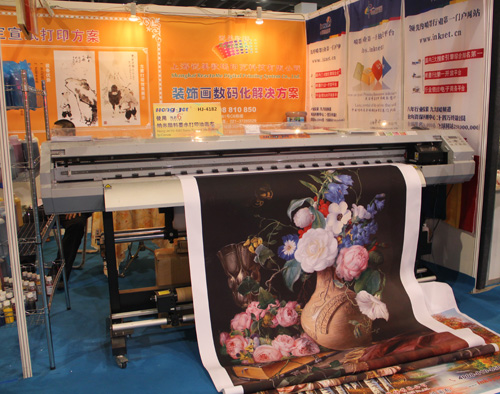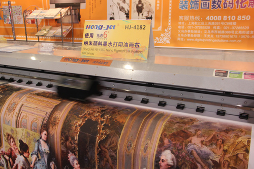 Hong-Jet 4182使用“鴻彩6®”四代顏料墨水(油畫布專用)高端油畫復制方案:“鴻彩6®”四代顏料墨水(油畫布專用)具有極高之物理化學穩定性,不堵塞噴頭,防水、耐光、抗紫外線,戶外75-100年不褪色,適用于高端藝術品復制。此次中國義烏框業與裝飾畫展覽會,Hong-Jet 4182配合“鴻彩6®”四代顏料墨水(油畫布專用)現場打印油畫布,畫面清晰、逼真,藝術品中的人物更是栩栩如生,仿若名家真跡,吸引了現場眾多觀眾的眼球。