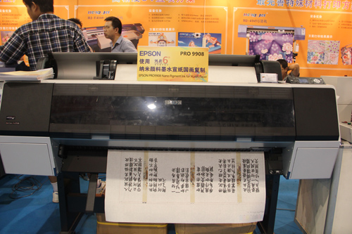 EPSON 9908使用“鴻彩6®”四代顏料墨水(宣紙專用)高端宣紙藝術品復制方案:此方案由EPSON 9908配合“鴻彩6®”四代顏料墨水(宣紙專用)和輸出軟件及ICC生成軟件組成,可高速輸出宣紙、藝術紙。EPSON 9908微壓電打印技術,讓打印效果更佳出眾,打印精度也足以滿足客戶輸圖需求。展會現場“鴻彩6®”四代顏料墨水(宣紙專用)穩定的物理結構和防水、耐光、抗紫外線的出色品質,借助EPSON 9908的配合輸出,*美呈現在一張張名家字畫上。