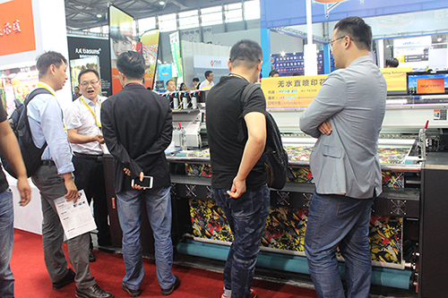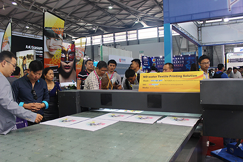 配套涂料無水印花方案,上海銳美展示了三款不同的數碼印花機,以滿足不同印花客戶的生產需求。