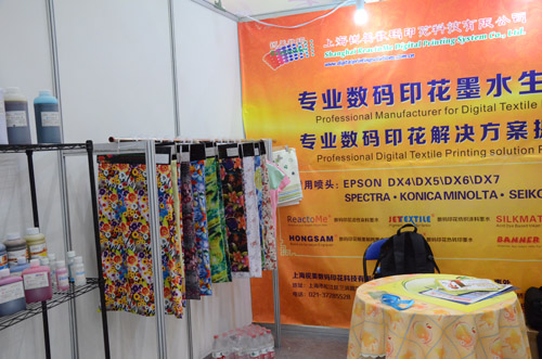 2013中國(guó)柯橋國(guó)際紡織品博覽會(huì)現(xiàn)場(chǎng),上海銳美為行業(yè)客戶展示有“鴻美®”二代熱轉(zhuǎn)印墨水轉(zhuǎn)移印花滌綸布樣品;“捷特絲®”二代紡織品涂料墨水打印T恤、棉布樣品;“銳美®”活性染料墨水打印棉布樣品以及紡織品全系列數(shù)碼印花墨水產(chǎn)品--“銳美®”活性染料墨水、“鴻美®”二代熱轉(zhuǎn)印墨水、“旗幟王?”旗幟條幅直噴墨水、“捷特絲®”二代紡織品涂料墨水。另外,本次展會(huì)上,眾多行業(yè)客戶尤其關(guān)注鴻盛數(shù)碼各種工業(yè)噴頭系列的專用數(shù)碼印花墨水,并現(xiàn)場(chǎng)針對(duì)鴻盛數(shù)碼全系列紡織品數(shù)碼印花方案進(jìn)行了詳細(xì)了解和洽談。