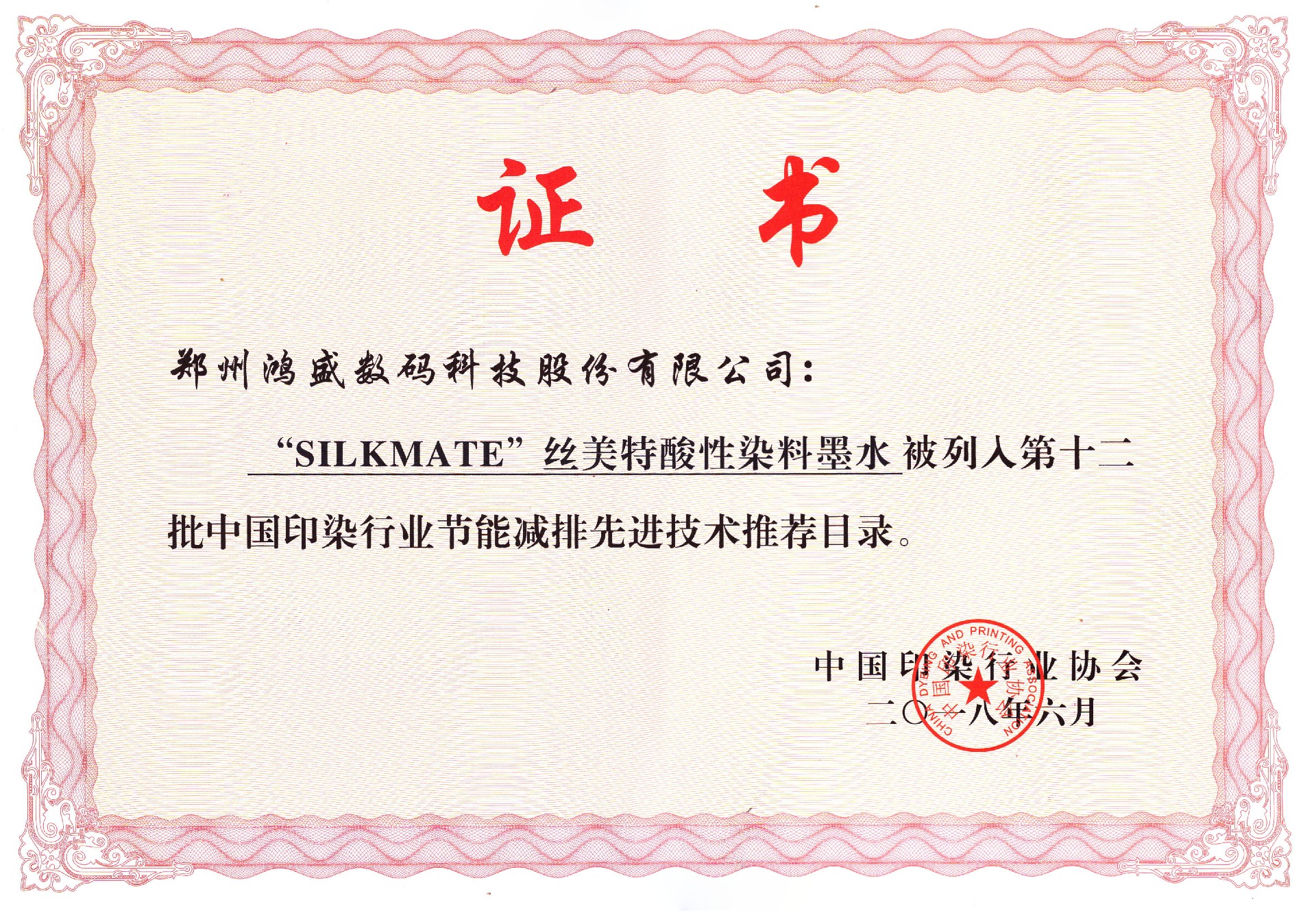 2018年,絲美特酸性染料墨水被列入第十二批《中國印染行業節能減排先進技術推薦目錄》