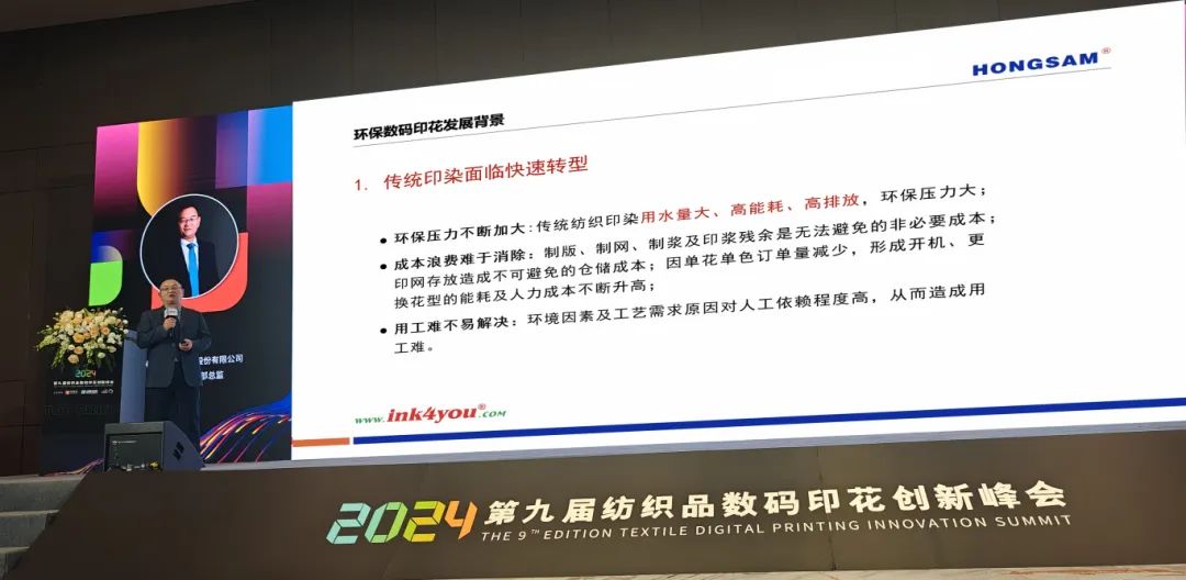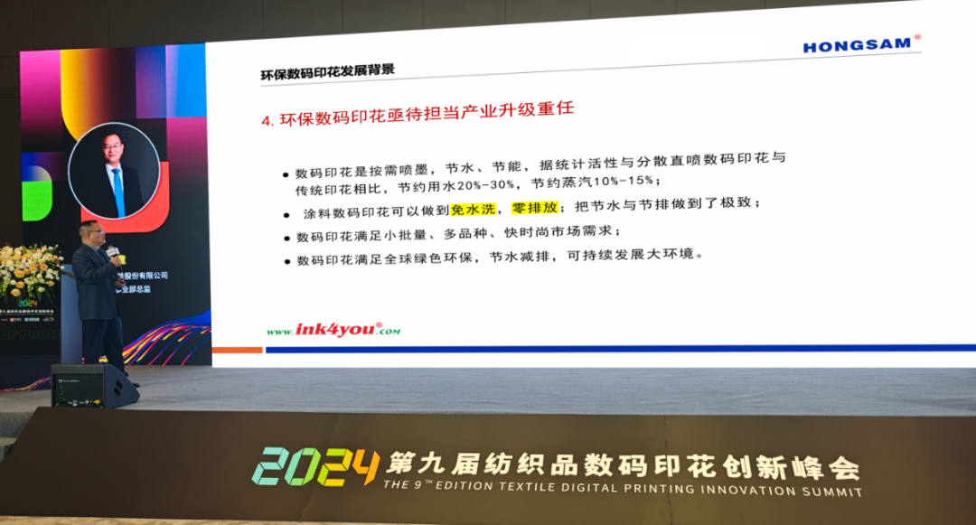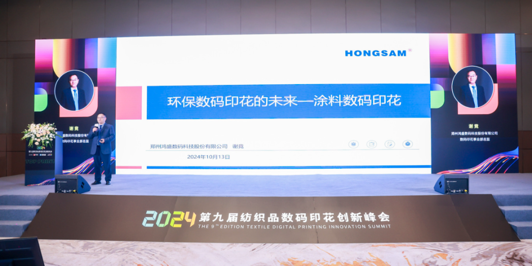 峰會會議內容ACADEMICPRESENTATIONS本次大會上,鄭州鴻盛數碼科技股份有限公司數碼印花事業部謝竟先生以《環保數碼印花的未來——涂料數碼印花》為題對涂料數碼印花進行了詳細闡述,從環保數碼印花發展背景,談到涂料數碼印花的特點、優勢,以及涂料數碼印花高速發展的現狀和未來的發展潛力。由淺入深,對涂料數碼印花進行了深入的分析。分享中有很多專業的知識、行業的發展情況,也給大家帶來很多啟示。