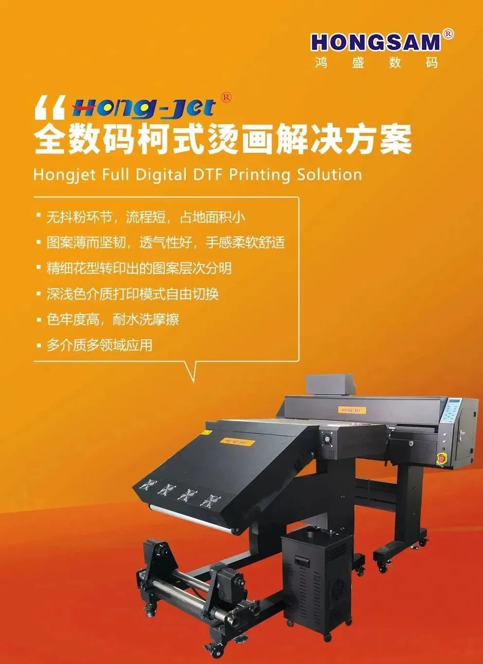 鴻捷全數碼柯氏燙畫解決方案適用于棉織物和多種介質,無需抖粉環節,其工藝極大程度解決了抖粉膜轉印存在手感和透氣性等問題,成為數碼印花領域很好的一種補充方案,為繁榮數碼印花產業,增添了一種更接地氣的解決途徑。該方案打印流程更短,全部流程只有三個步驟:打印——烘干——燙印。此方案無“抖粉”環節,減少了疵品的發生幾率,并回避了不少抖粉方案存在的問題。