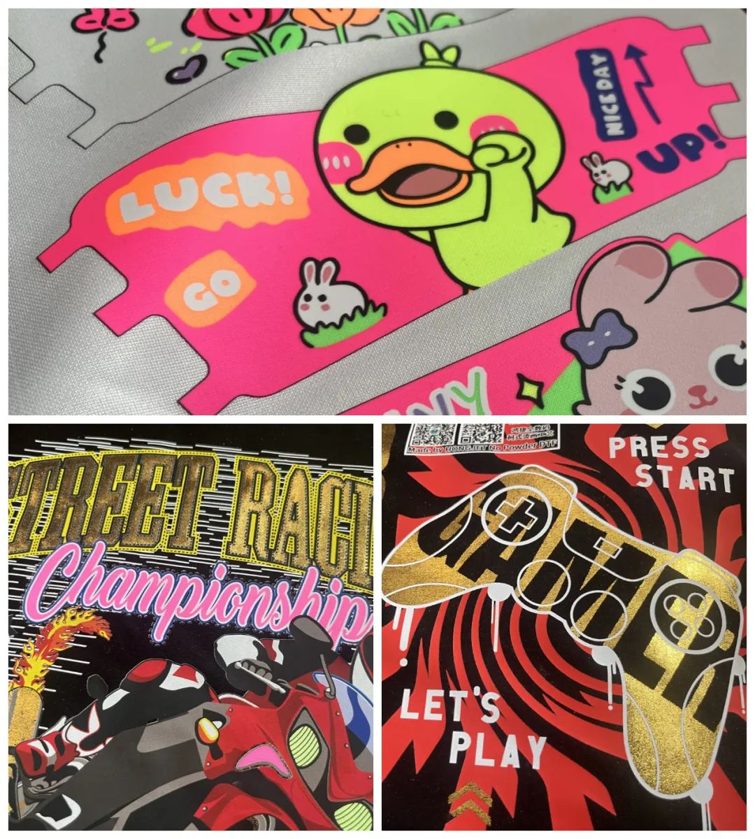 除此之外,此次展會我們會展示行業爆火的“網紅”工藝,免抖粉燙金工藝、八色熒光免抖粉燙畫、DTF燙金工藝,為競爭日益激烈的市場帶來新的活力與增長點。鴻盛數碼作為行業創新的引領者,將不斷為行業提供新的技術應用與產品創新。