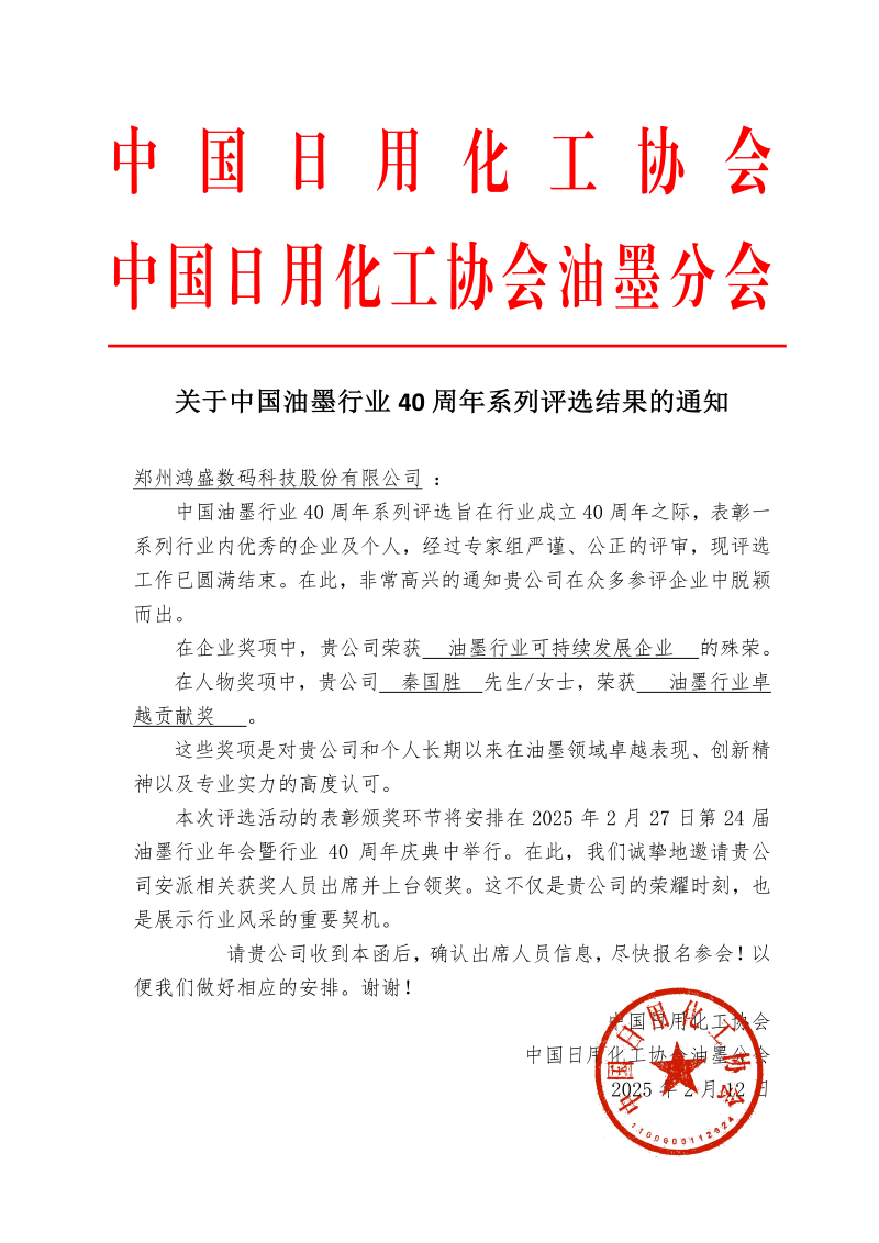2025年2月26日至28日,第二十四屆全國(guó)油墨行業(yè)年會(huì)暨油墨行業(yè)40周年慶典活動(dòng)在杭州隆重舉行。在這場(chǎng)匯聚行業(yè)精英的盛會(huì)中,鴻盛數(shù)碼榮獲“油墨行業(yè)可持續(xù)發(fā)展企業(yè)”,公司創(chuàng)始人、董事長(zhǎng)、總經(jīng)理秦國(guó)勝先生榮獲“油墨行業(yè)卓越貢獻(xiàn)獎(jiǎng)”。