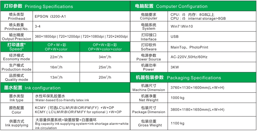 水性皮革數碼印花機特征參數